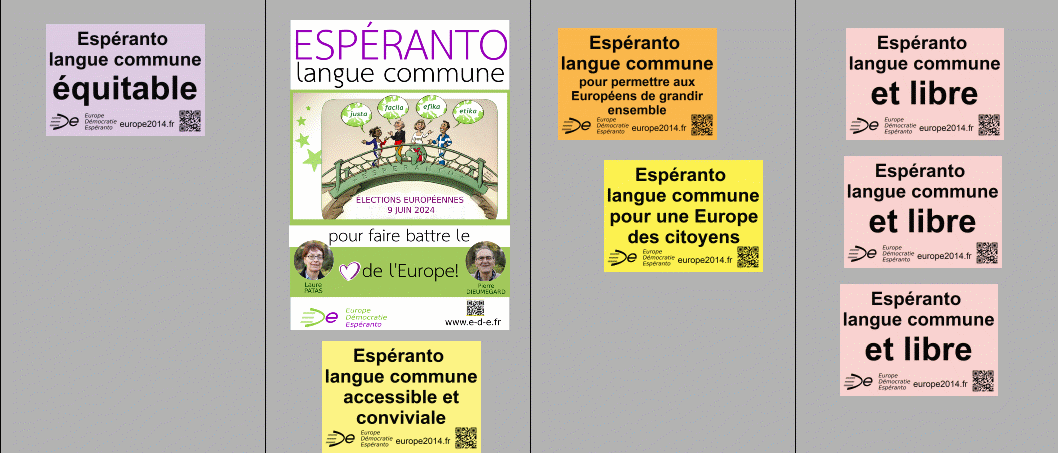 En principe, il y aura la place pour une « grande affiche » au format A1 (594×841 mm) et une « petite affiche » au format A3 (297×420 mm). Pour la liste « Espéranto langue commune », la grande affiche sera en couleurs, et imprimée pour toute la France métropolitaine. Par contre, la petite affiche peut facilement être imprimée par les boutiques de reprographie, et peut comporter des slogans différents.